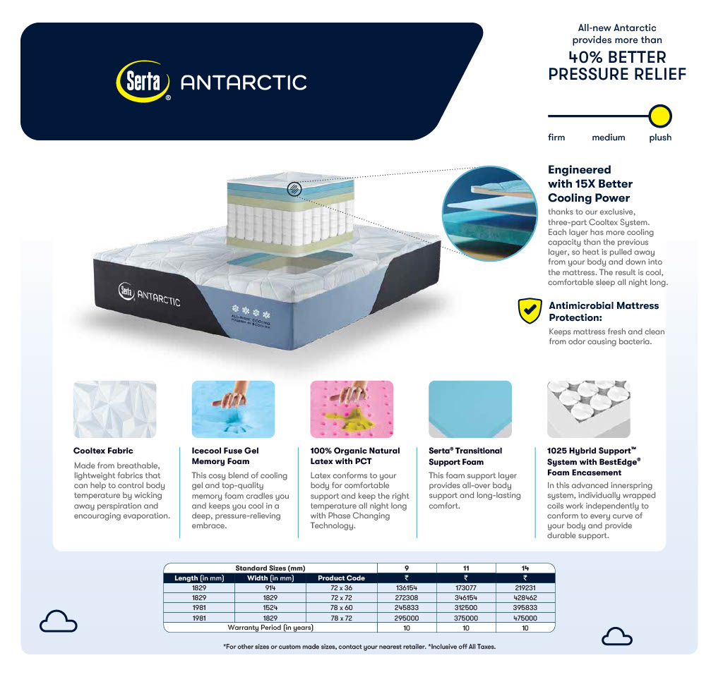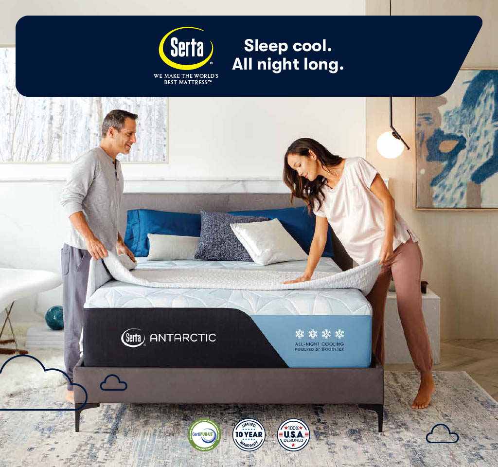 Experience next-level sleep with the Serta Antarctic Mattress, engineered for superior cooling and pressure relief. Designed with the exclusive three-part Cooltex System, it pulls heat away from your body for all-night cooling comfort.